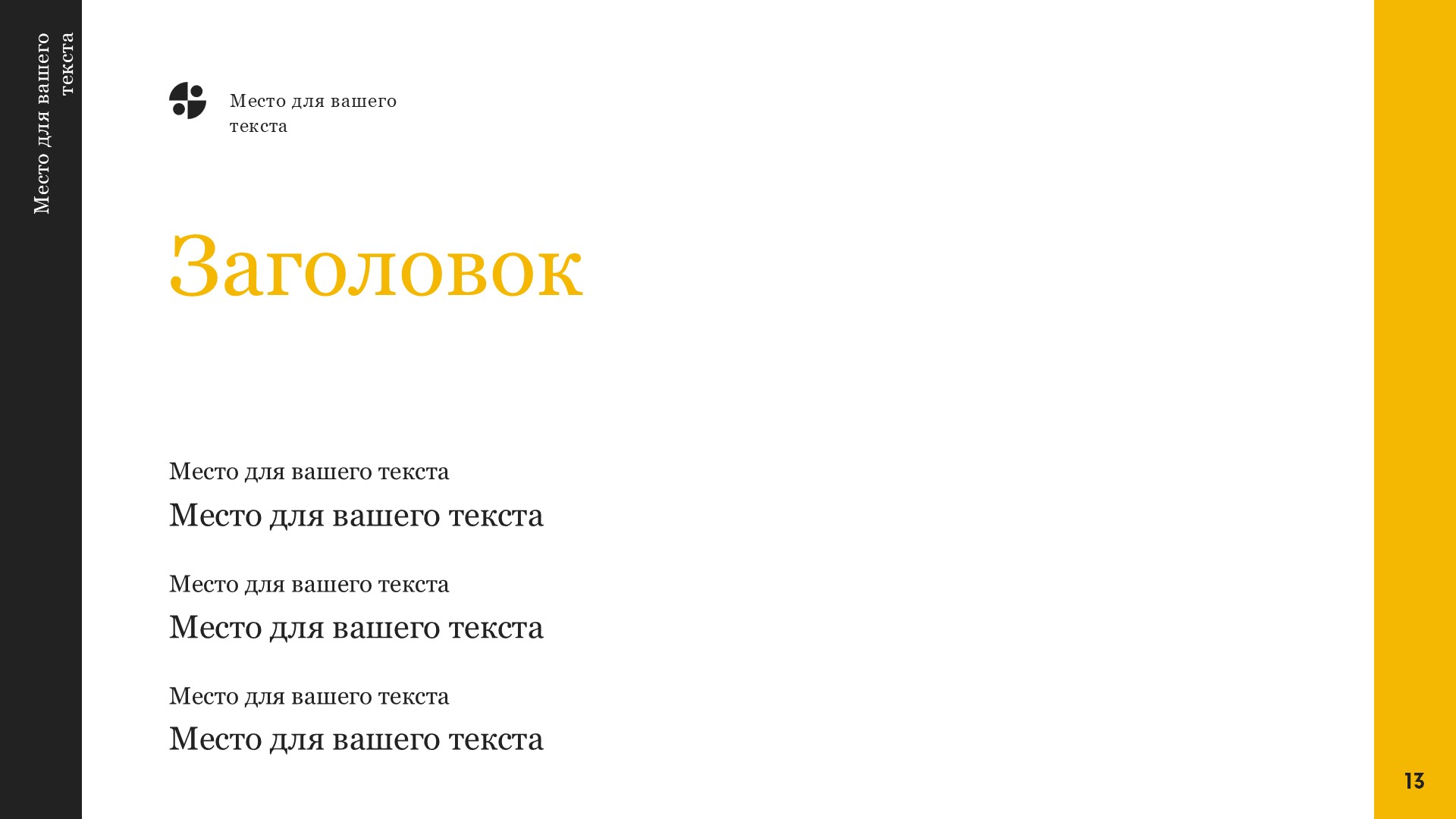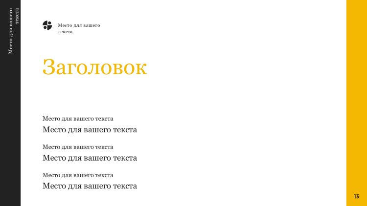 Черно-желтый шаблон презентации также включает в себя различные варианты макетов слайдов, которые позволят вам организовать информацию логично и эффективно.