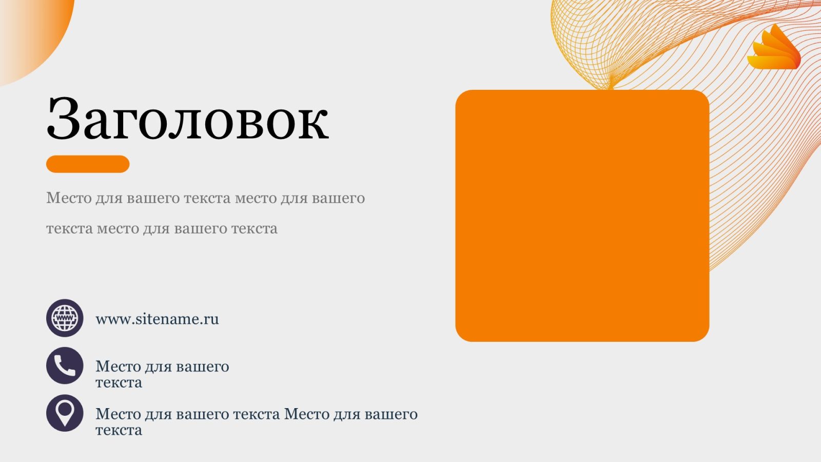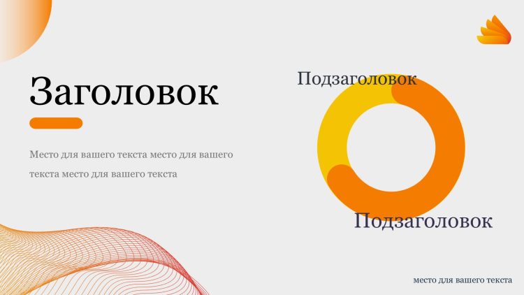 Оранжевый цвет шаблона придает ему яркость и энергию, что поможет привлечь внимание аудитории и создать позитивное впечатление. Оранжевый также ассоциируется с творчеством, инновациями и оптимизмом, что может помочь вам передать ваше сообщение с большей эмоциональной силой.