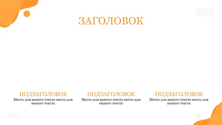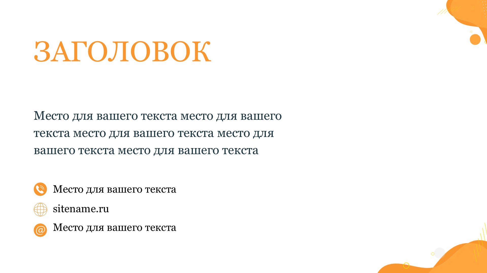 Оранжевый цвет шаблона придает ему яркость и энергию, что поможет привлечь внимание аудитории и создать позитивное впечатление. Оранжевый также ассоциируется с творчеством, инновациями и оптимизмом, что может помочь вам передать ваше сообщение с большей эмоциональной силой.