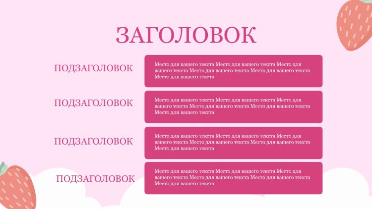 Шаблон презентации Розовый также включает в себя различные варианты макетов слайдов, которые позволят вам организовать информацию логично и эффективно.